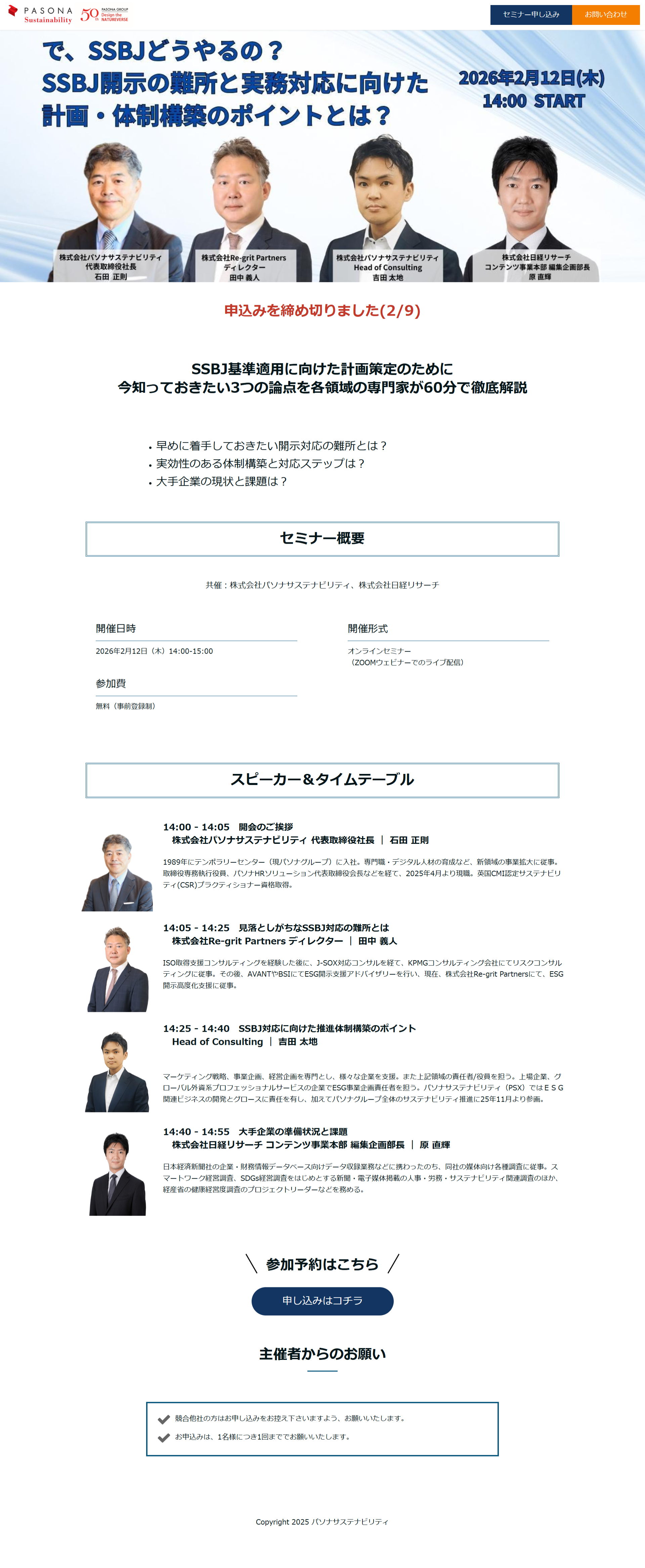 2026/02/12 【セミナー】2/12(木)『で、SSBJどうやるの?SSBJ開示の難所と実務対応に向けた計画・体制構築のポイントとは?』を開催しました。2026年04月28日 11:582025/12/08 【ニュースリリース】パソナサステナビリティとDigit.ink 12月より業務提携開始2026/03/10 【ニュースリリース】パソナサステナビリティとStayway 業務提携開始