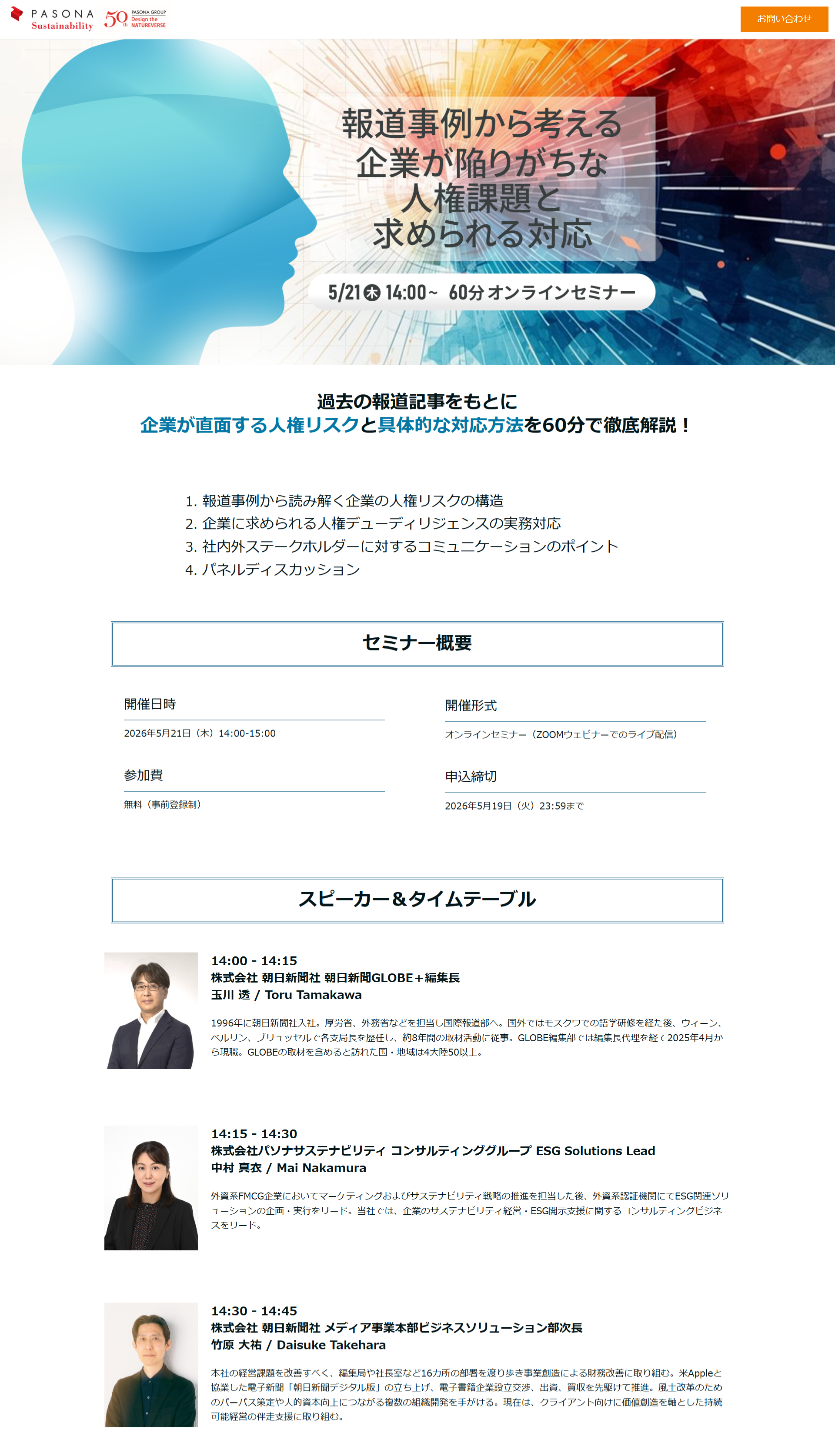 2026/04/23 【セミナー】5/21(木)「報道事例から考える企業が陥りがちな人権課題と求められる対応」Webinarをオンラインにて開催します(無料)2026年04月28日 12:15【報道事例から考える人権課題】企業が陥りがちな人権課題と求められる対応策を60分で徹底解説申し込みはコチラ2026/04/01 【セミナー】4/16(木)「緊急解説!3/23公開の人的資本可視化指針」Webinarをオンラインにて開催しました